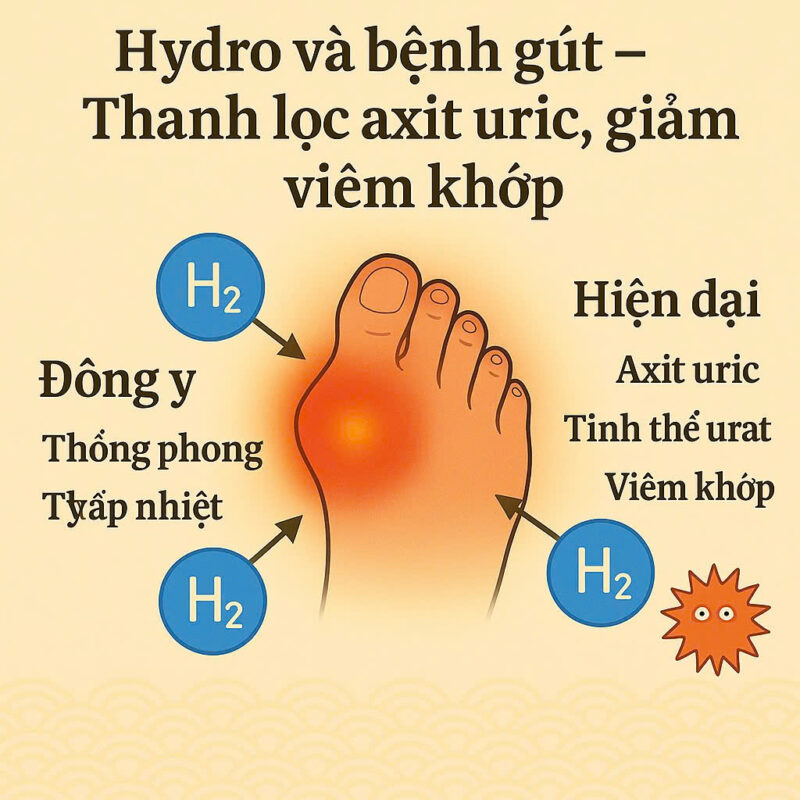 Hydro, nhờ khả năng chống oxy hóa, kháng viêm và hỗ trợ đào thải độc tố, được coi là liệu pháp tự nhiên giúp giảm viêm đau, bảo vệ khớp và ngăn ngừa biến chứng của bệnh gút.