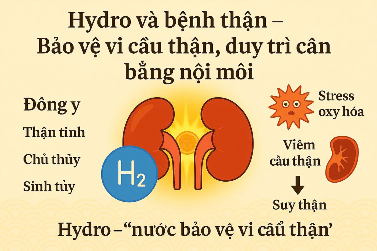Trong y học hiện đại, bệnh thận mạn là “kẻ giết người thầm lặng”, thường tiến triển âm thầm do tiểu đường, cao huyết áp, viêm cầu thận. Nguyên nhân chính thúc đẩy tổn thương là stress oxy hóa và viêm mạn, phá hủy vi cầu thận, dẫn tới suy thận. Hydro, nhờ cơ chế trung hòa gốc tự do, kháng viêm và bảo vệ mạch máu thận, được xem là liệu pháp tự nhiên giúp thận khỏe mạnh, kéo dài tuổi thọ.