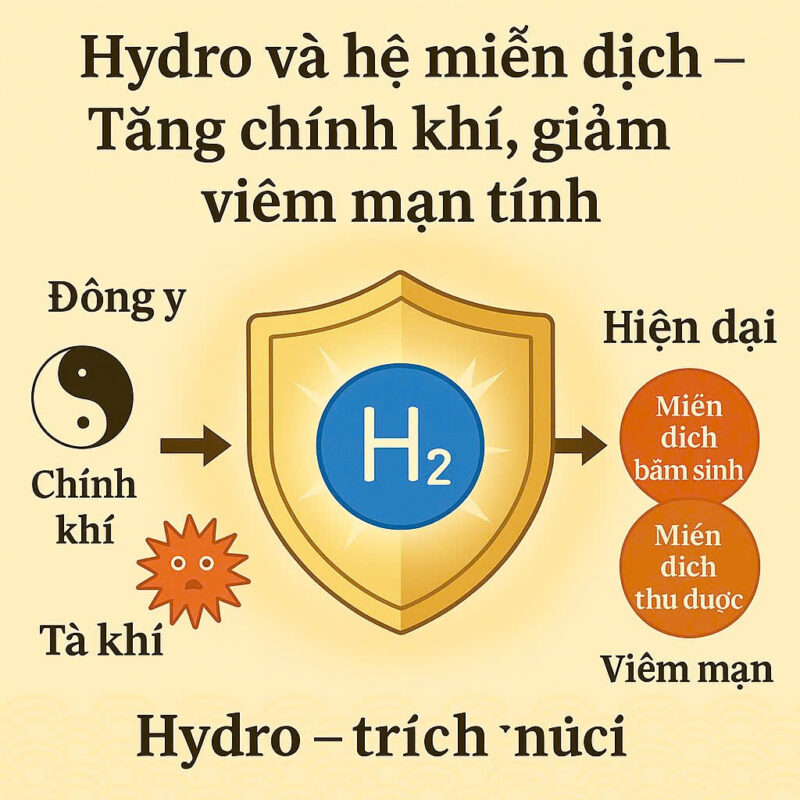 Trong y học hiện đại, hệ miễn dịch bao gồm miễn dịch bẩm sinh và miễn dịch thu được, hoạt động dựa trên sự nhận diện và loại bỏ tác nhân lạ. Tuy nhiên, stress oxy hóa, viêm mạn, lối sống kém lành mạnh khiến hệ miễn dịch suy yếu hoặc rối loạn (tự miễn, dị ứng). Hydro, nhờ cơ chế chống oxy hóa, kháng viêm và điều hòa miễn dịch, được xem là yếu tố giúp tăng cường chính khí và bảo vệ sức khỏe lâu dài.