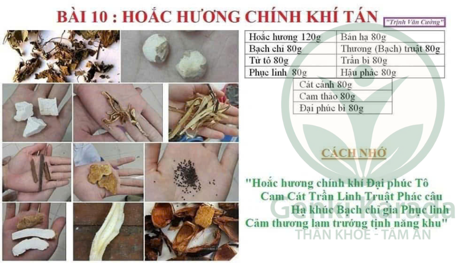 Hoắc hương, Tử tô, Bạch chỉ → phát biểu tán hàn, hành khí hòa trung, chỉ nôn tiêu trệ.